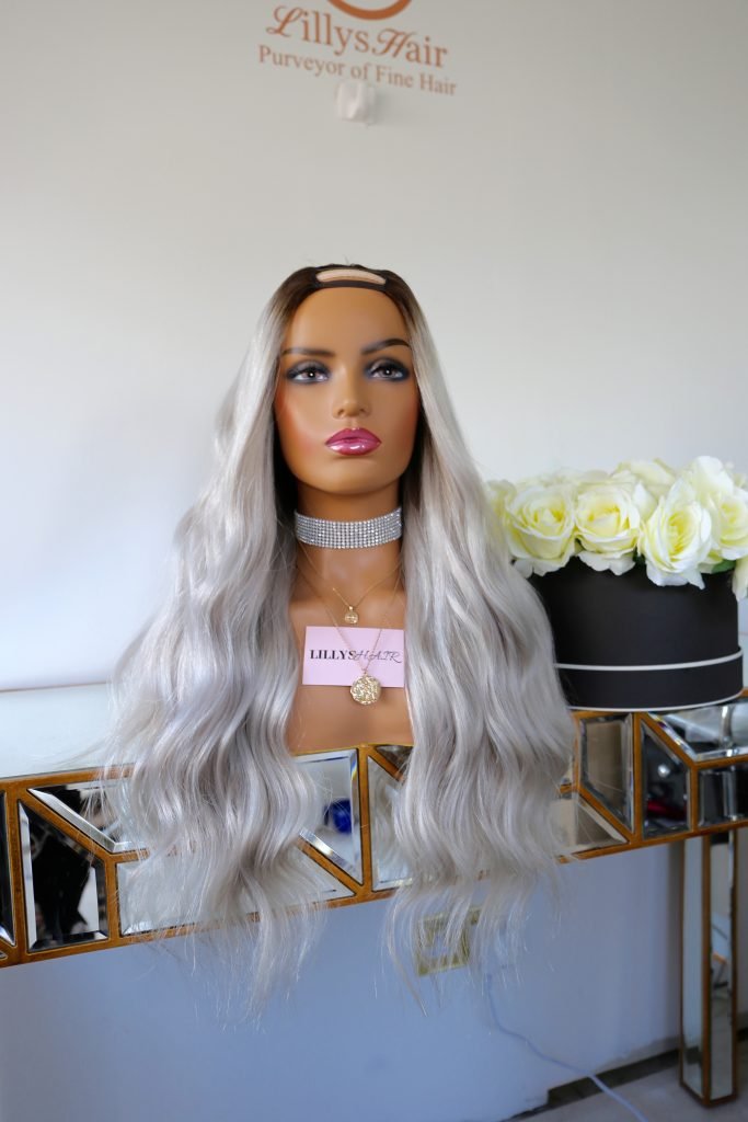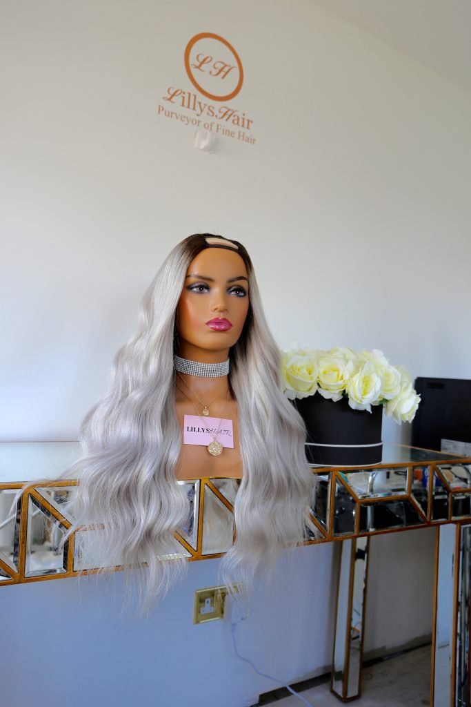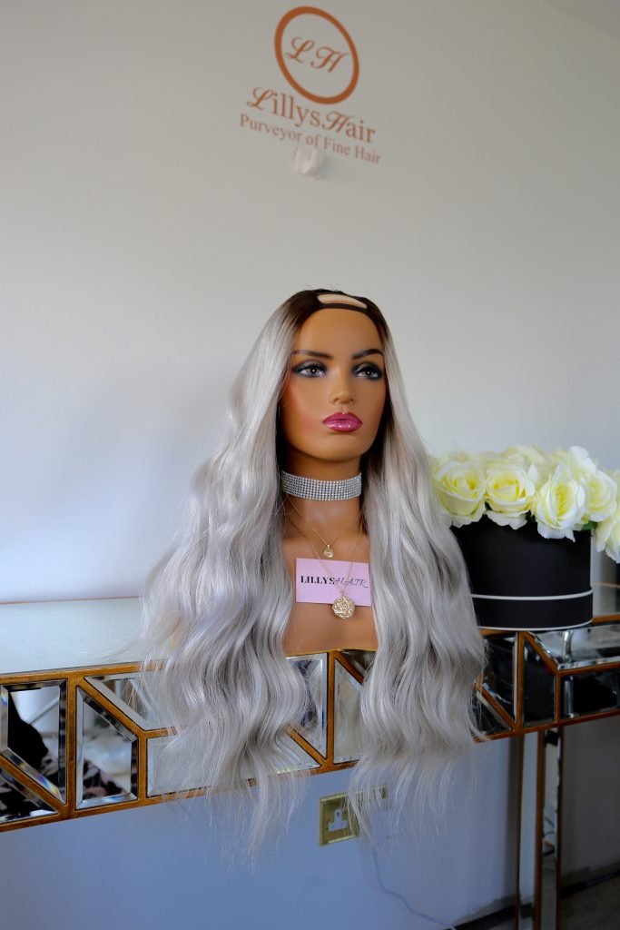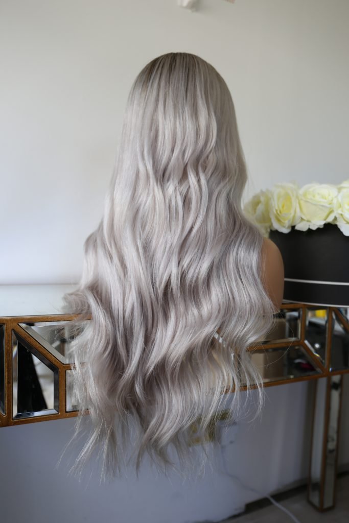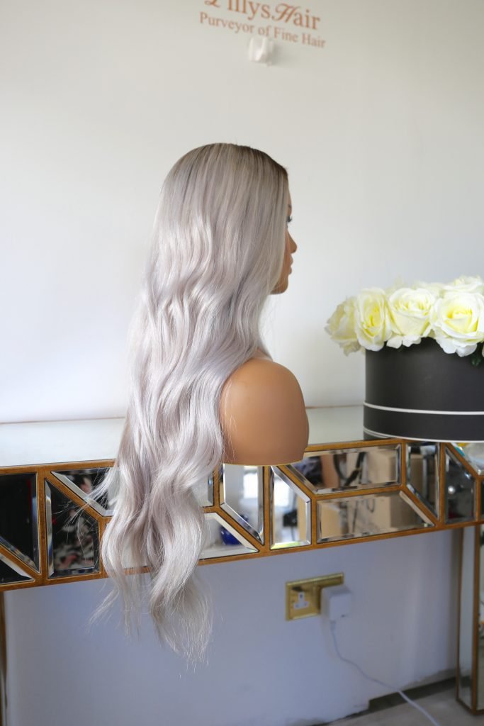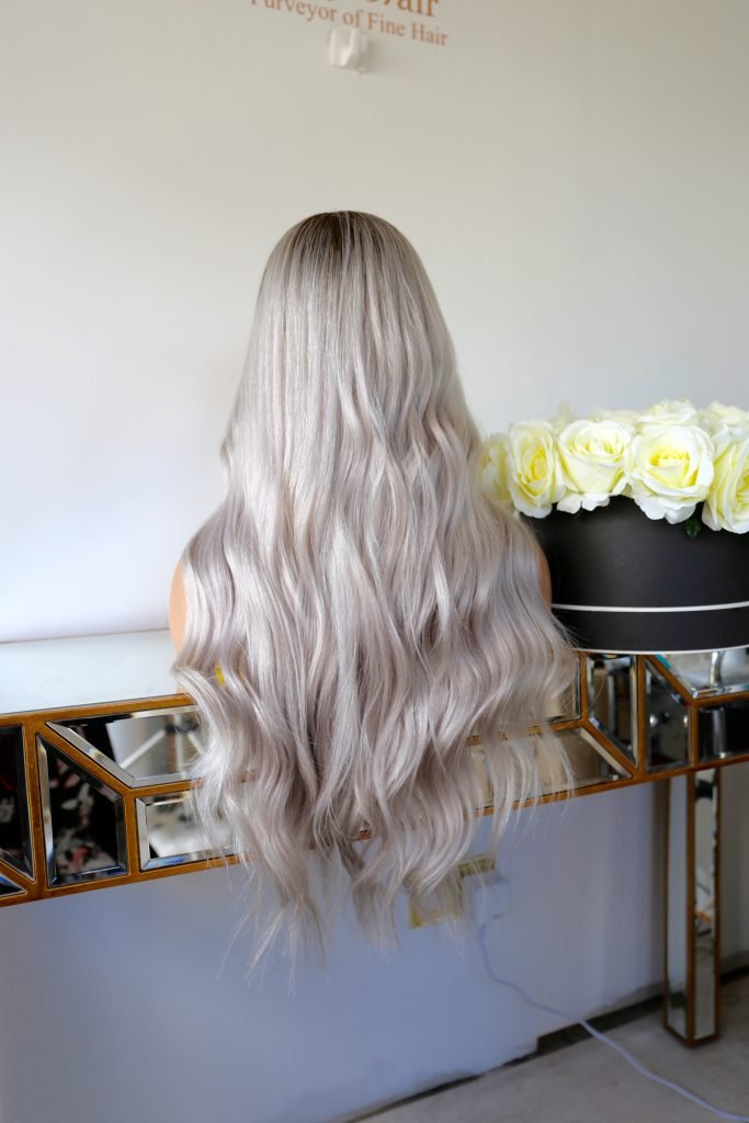 Colour: Silver with 1″ ash brown root (She can be made with no root or a different root colour, please email us to discuss the root colour options if you would prefer something different).