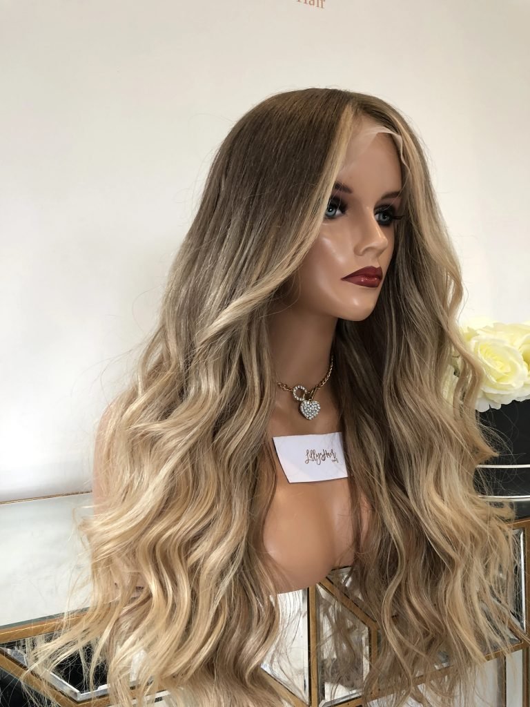 Colour: Medium-Dark blonde root melting into light golden blonde ends with face-framing highlights and dark blonde lowlights at the bottom.