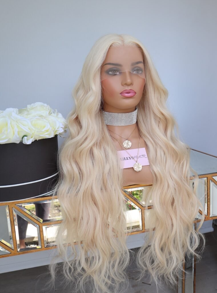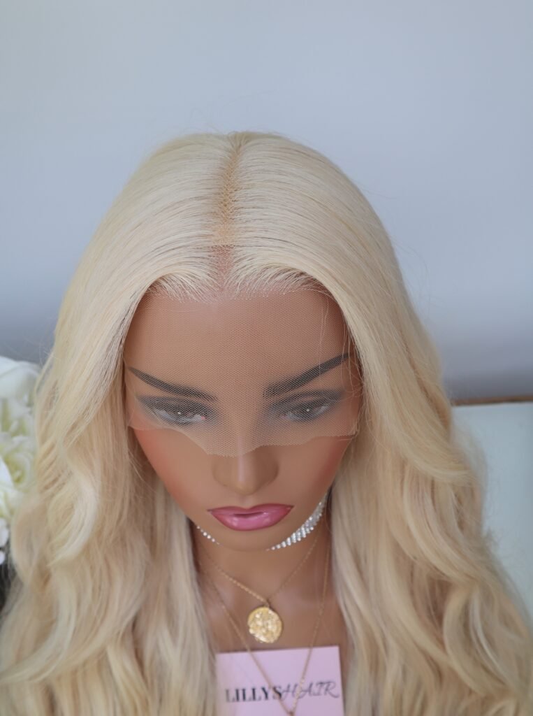 She is a 13X6 lace front wig with transparent lace, bleached knots, clips, combs and an adjustable elastic band for the perfect glue-less fit. She can be put in a middle/side part and can be put up in a ponytail.