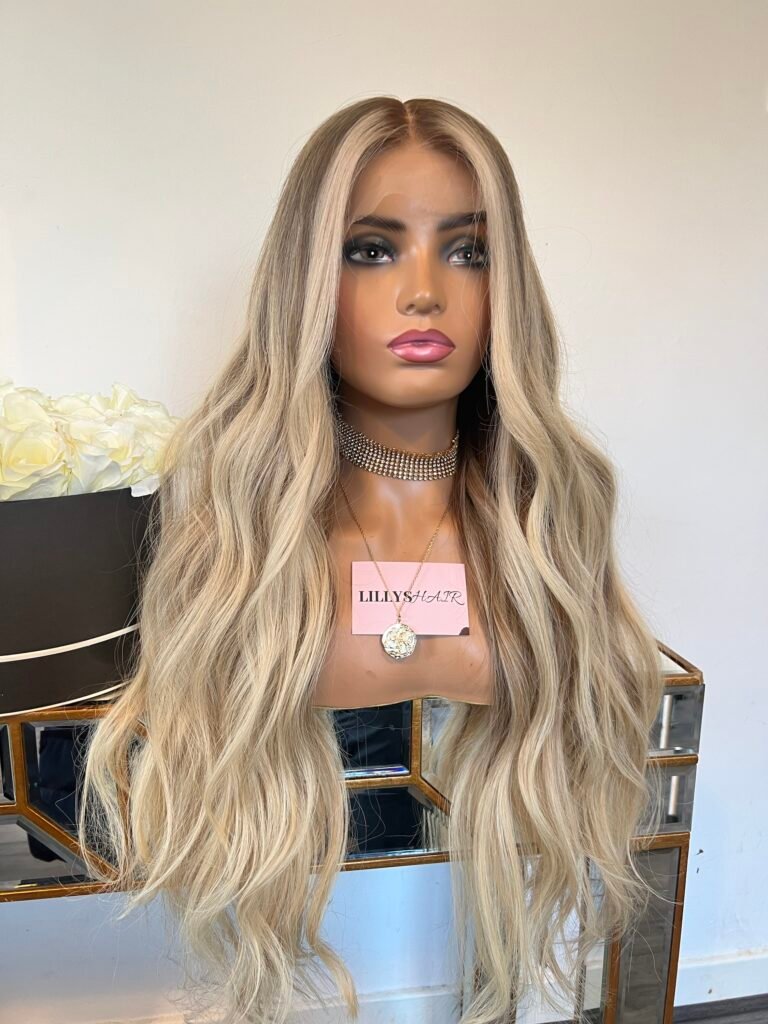 Colour: Highlighted medium blonde level 7 root melting into a light beige blonde, face framing highlight.