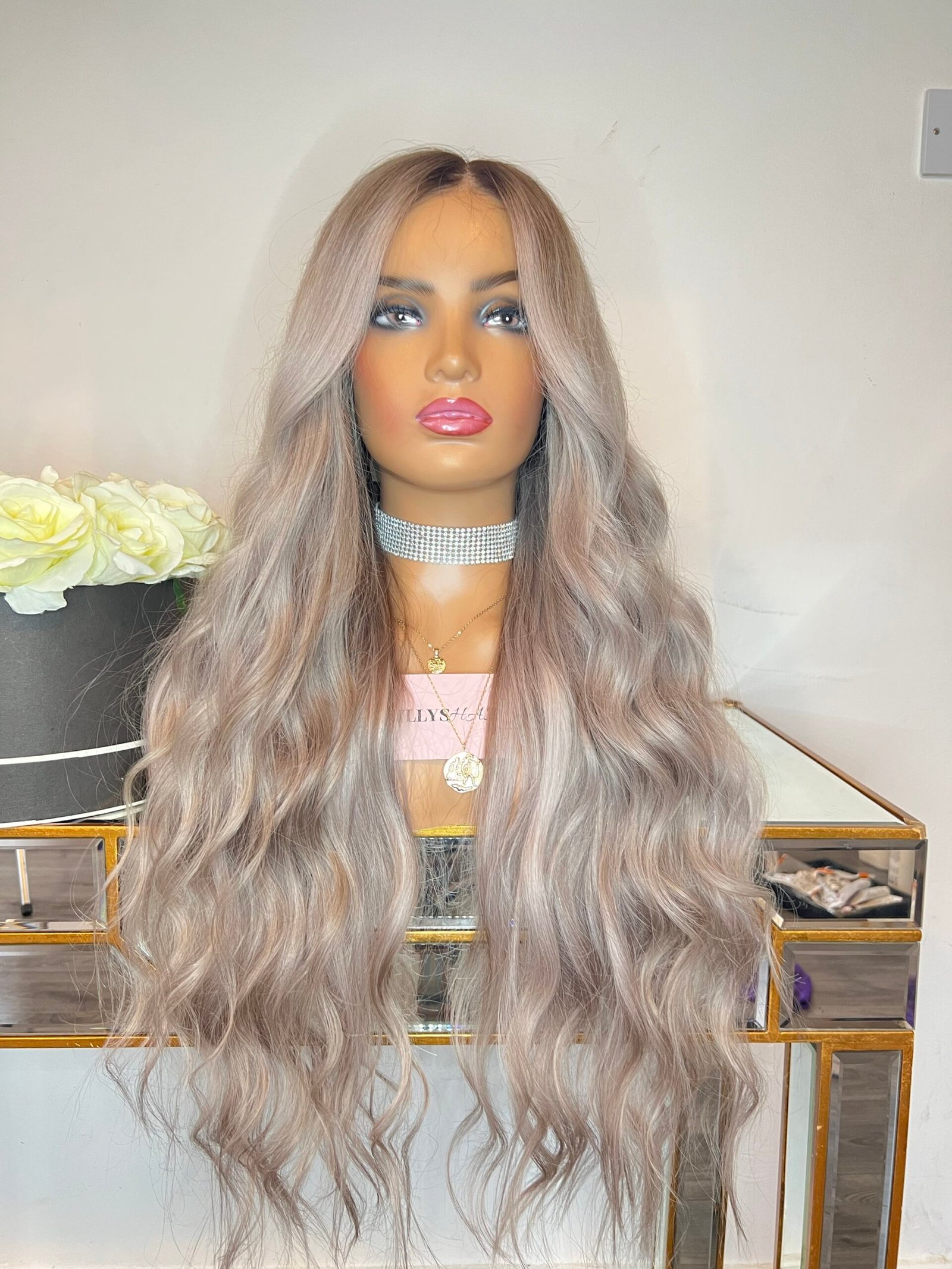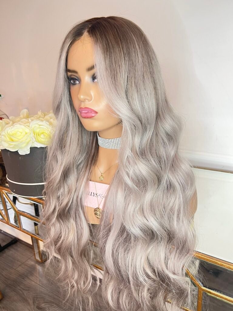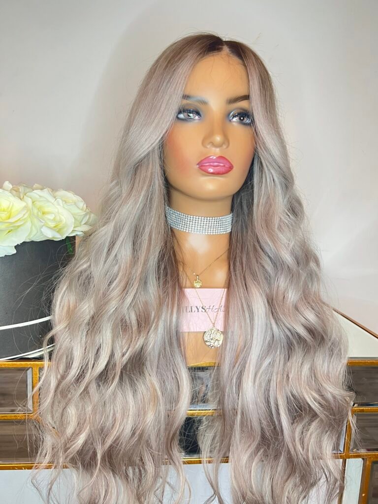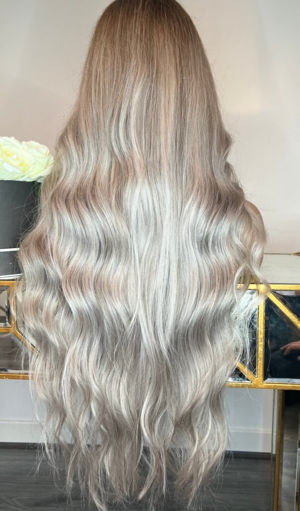 Colour: Medium Ash-blonde and silver balayage mix with a small dark ash blonde root..