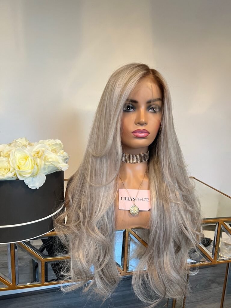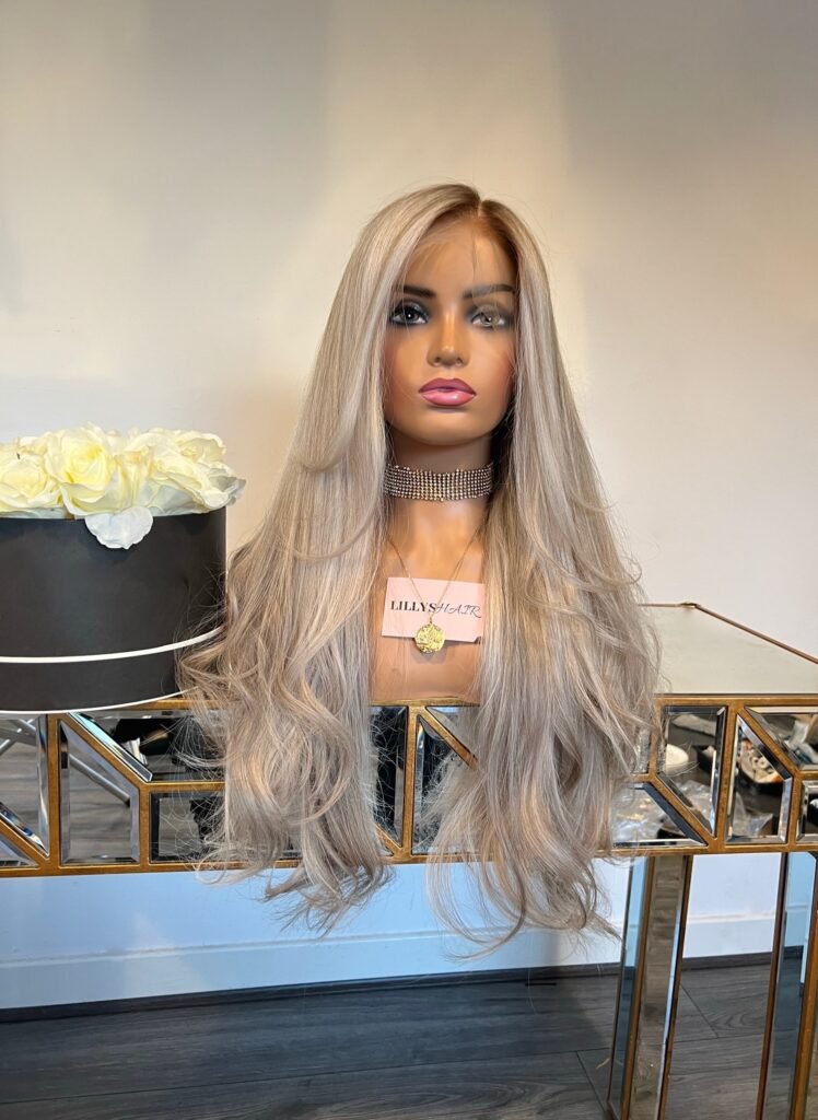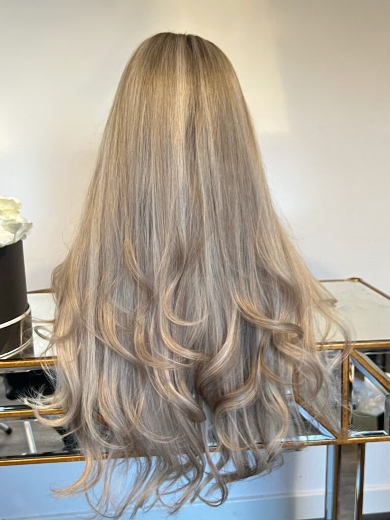 Colour: Platinum blonde with ash-blonde level 7 root and level 8 blonde lowlights.