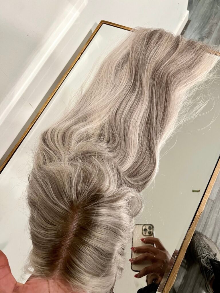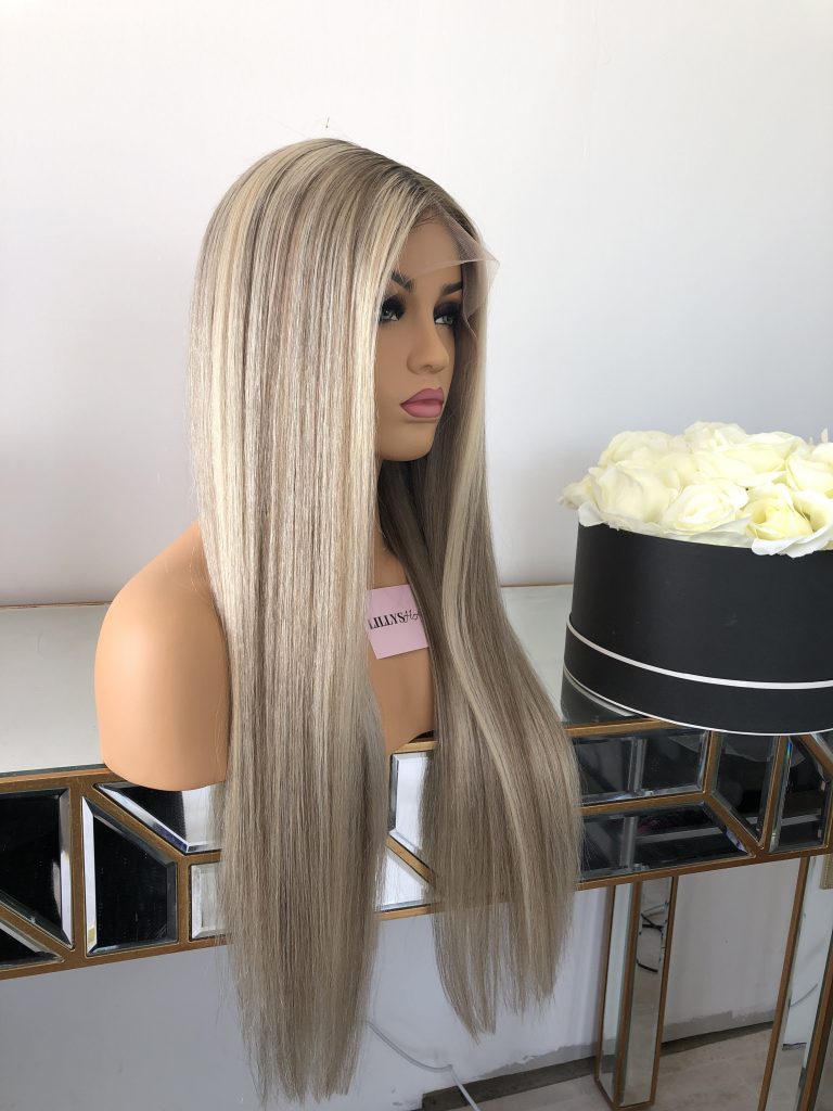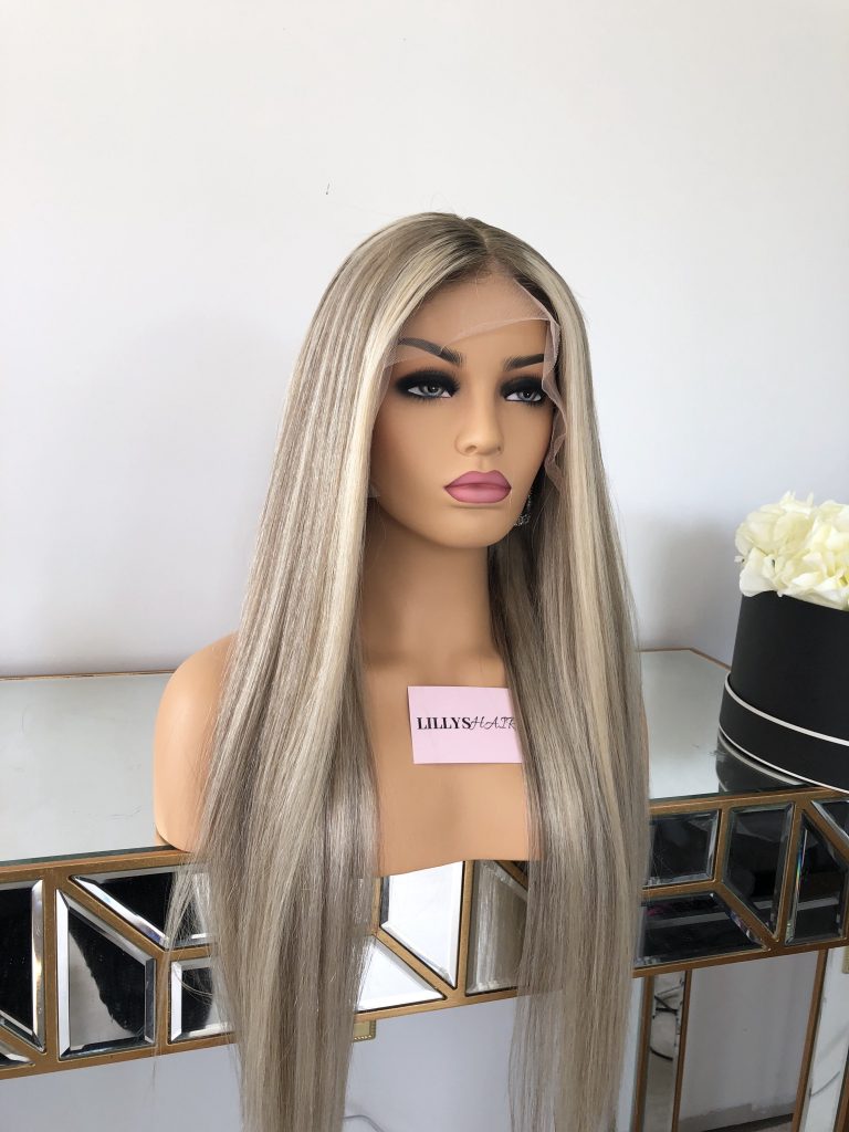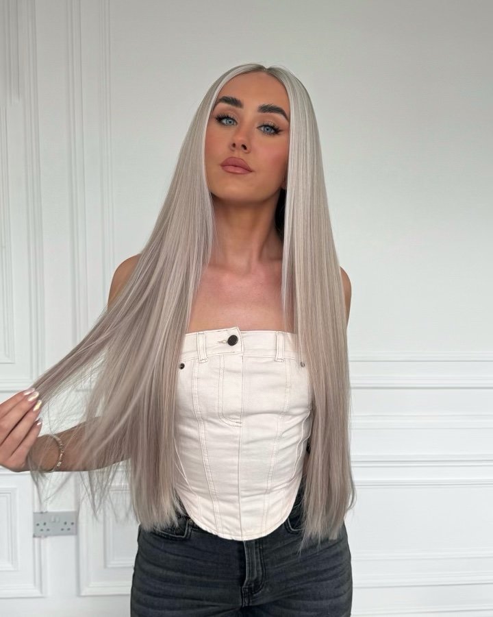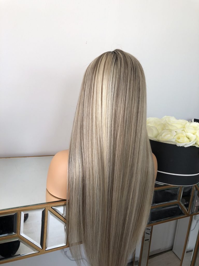 Colour: Platinum blonde with ash-blonde level 7 root and level 8 blonde lowlights.