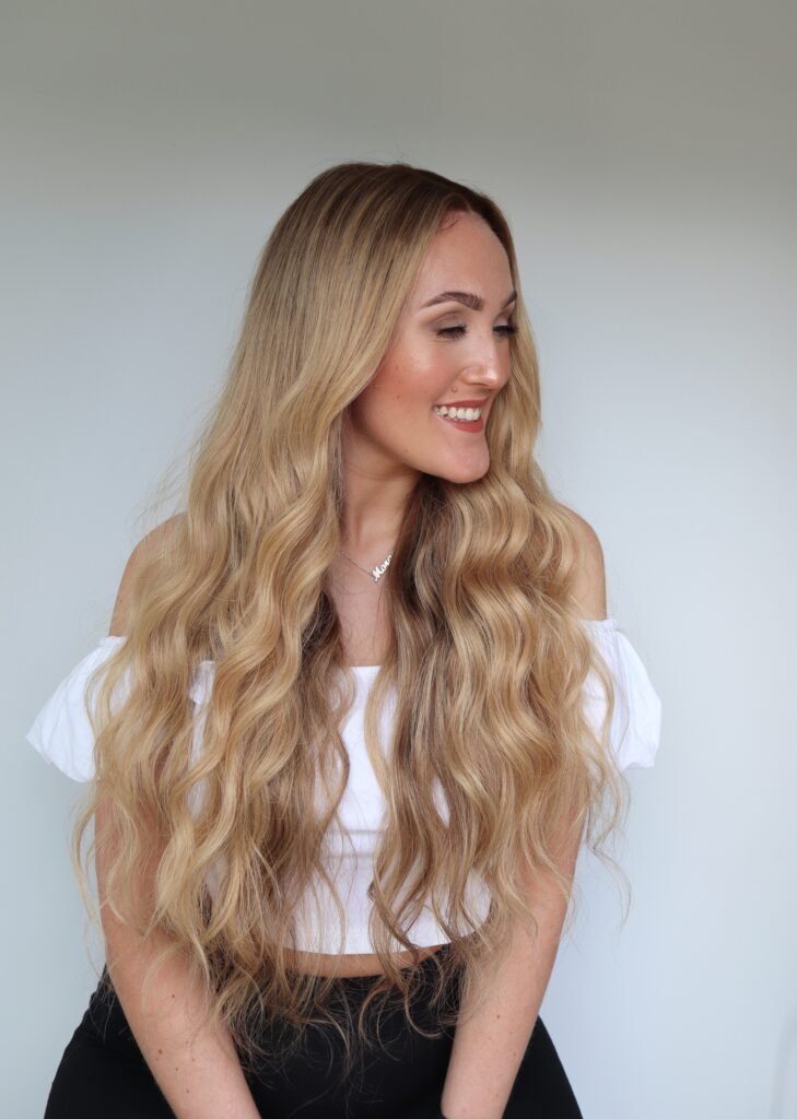 Colour: Balayage Highlighted golden brown root melting into Golden blonde with brown lowlights underneath.