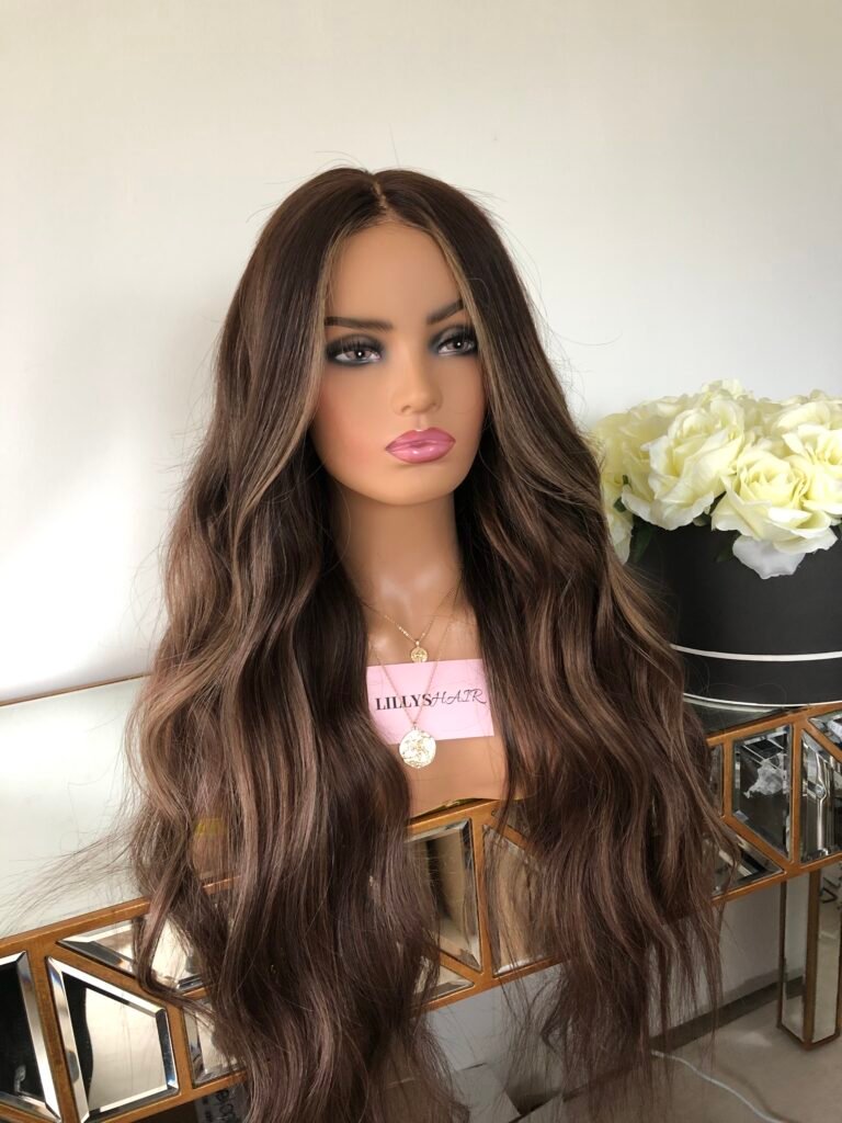 Colour: Light brown root melting into chocolate brown and light natural blonde. The hair used to make this wig is virgin hair, sorted by hand with the cuticles all going in the same direction.