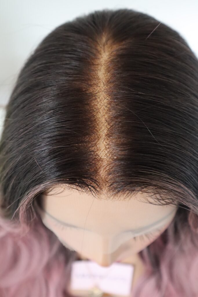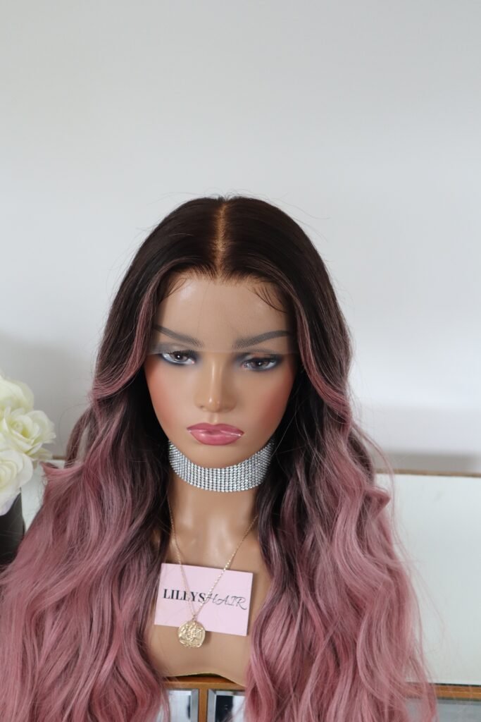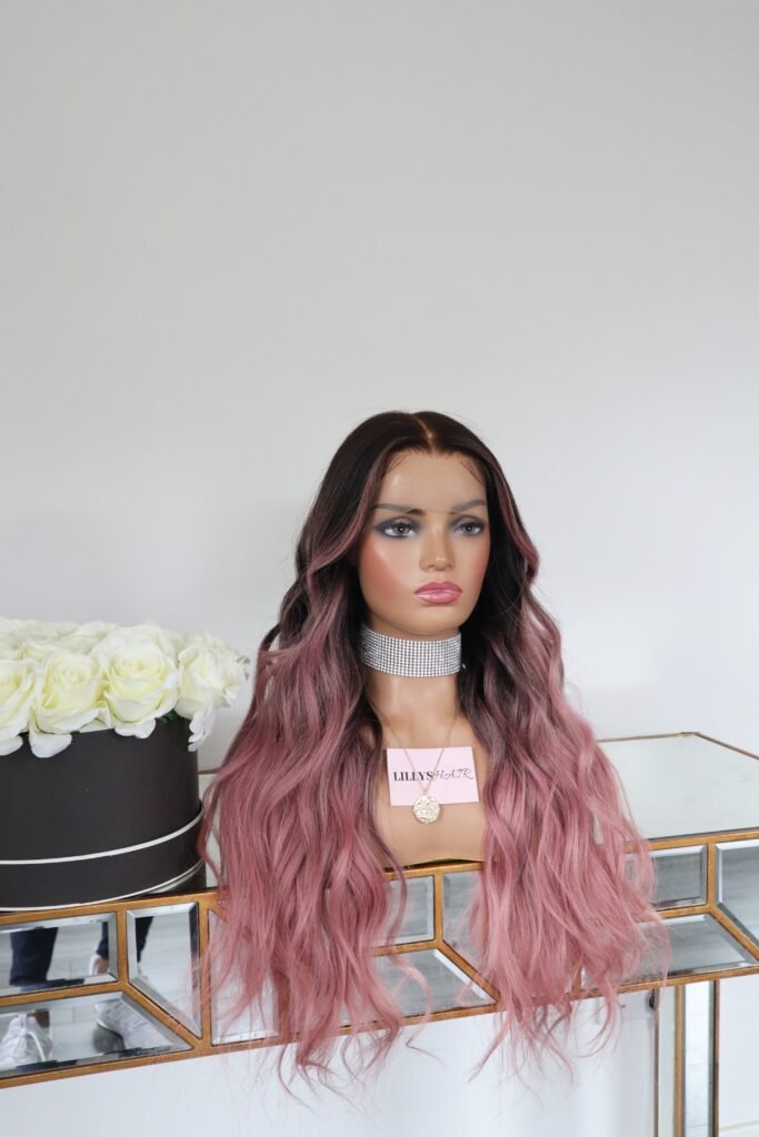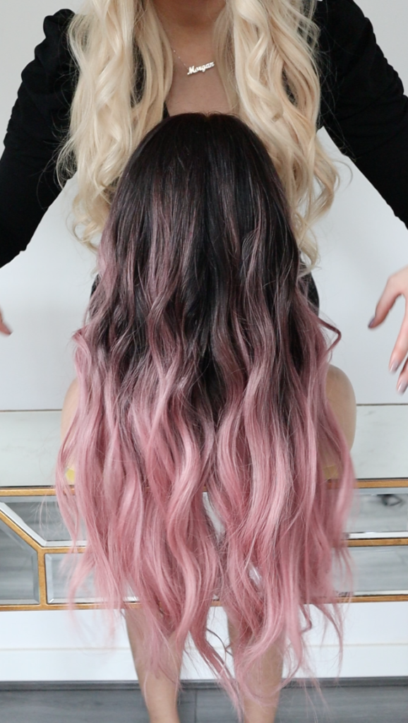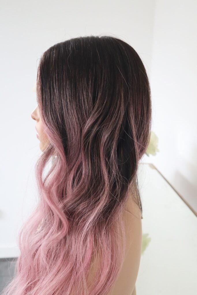 Colour: Balayage brown-black root melting into pink with face-framing highlights.