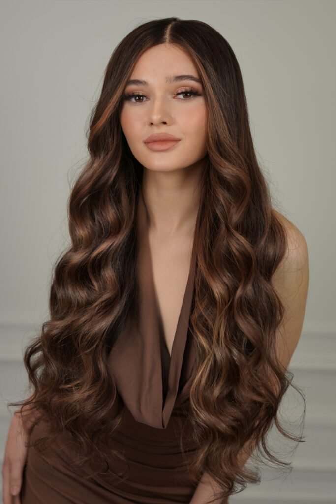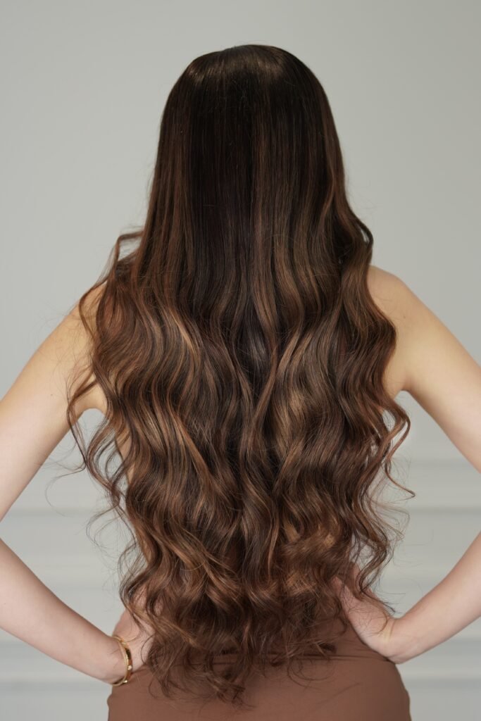 Colour: Brown-black root melting into a dark chocolate brown and medium blonde with face-framing highlights. The hair used to make this wig is virgin hair, sorted by hand with the cuticles all going in the same direction.