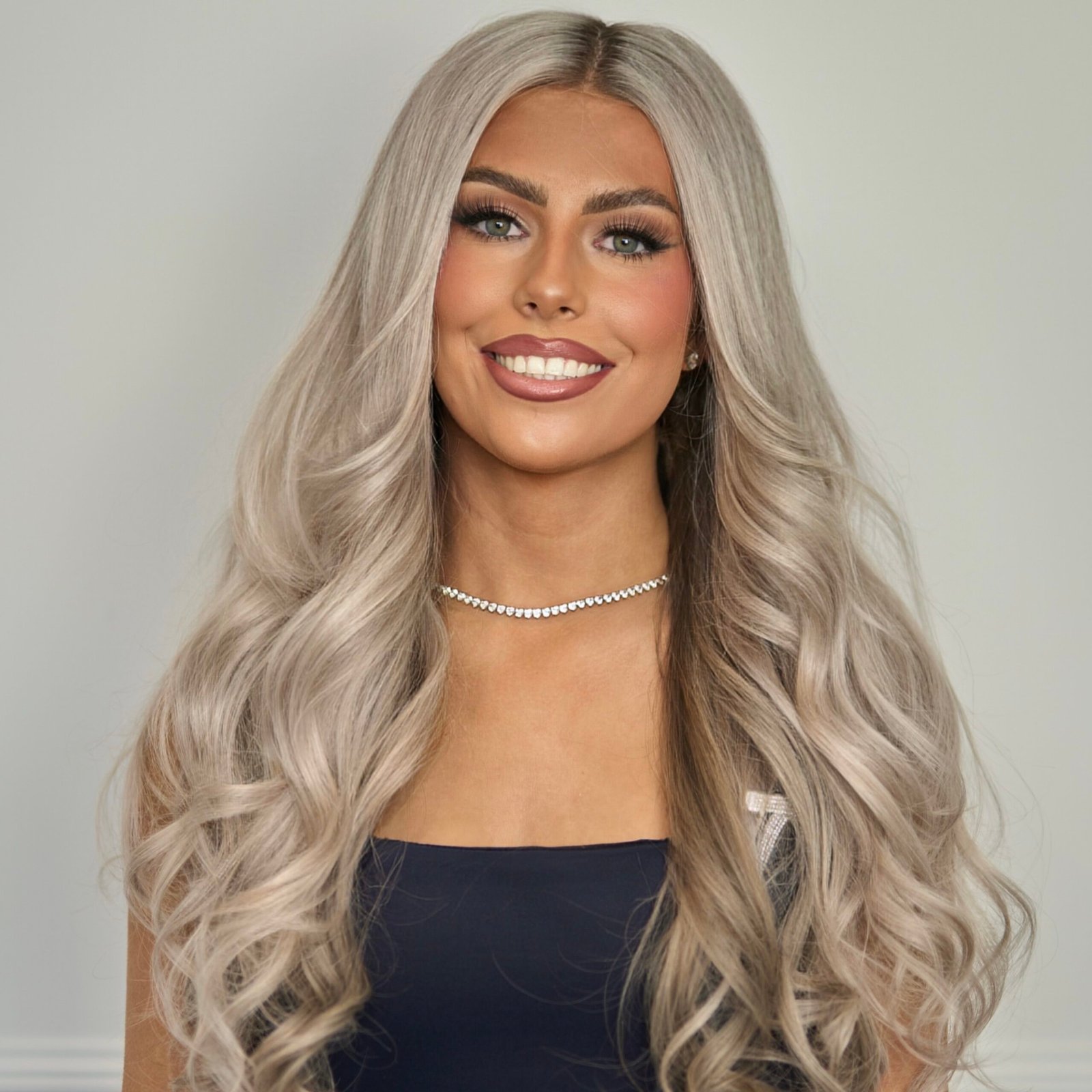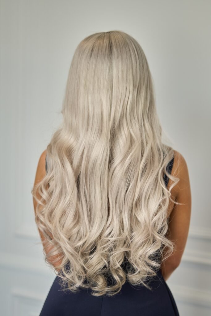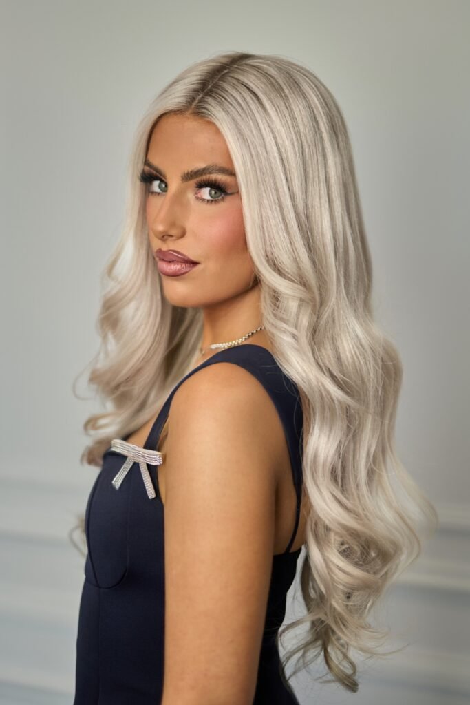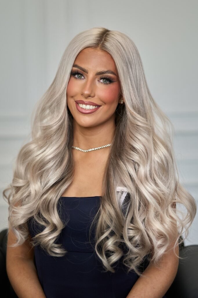 Colour: Silver blonde with a medium level 7 ash blonde root and lowlight underneath.