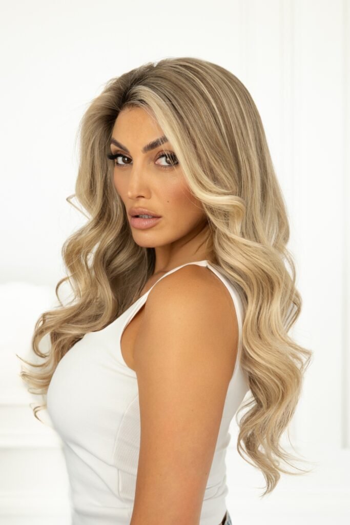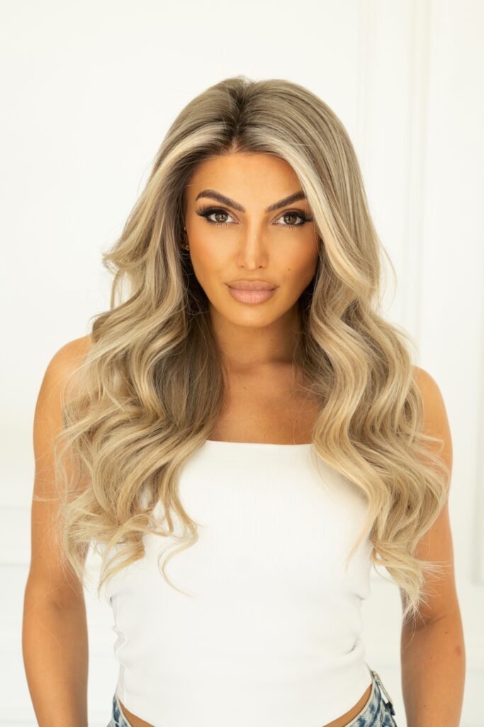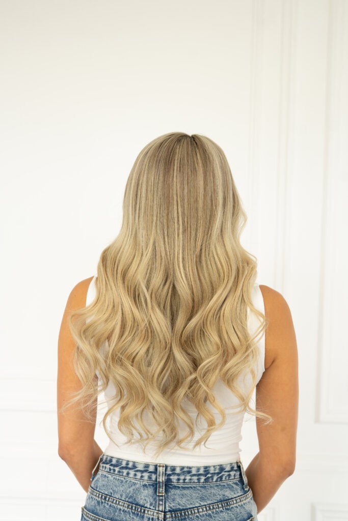 The Iris unit is made from multi dimensional hand painted light golden blonde paired with champagne blonde strands giving that laid-back beachy vibe. The gorgeous golden hue is the ultimate hair trend with sunny hues and warm undertones, it will make you feel like sunshine!