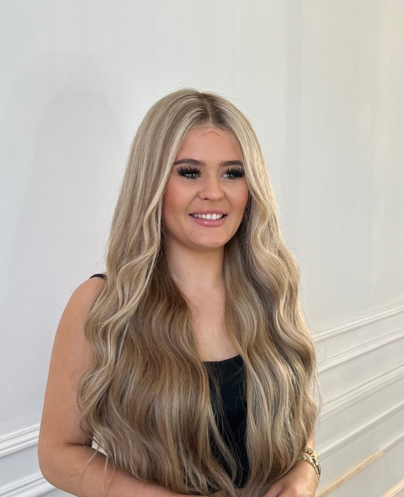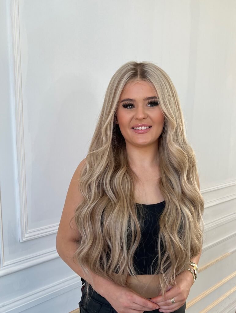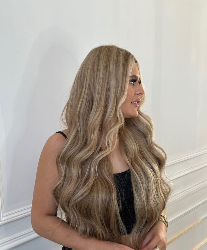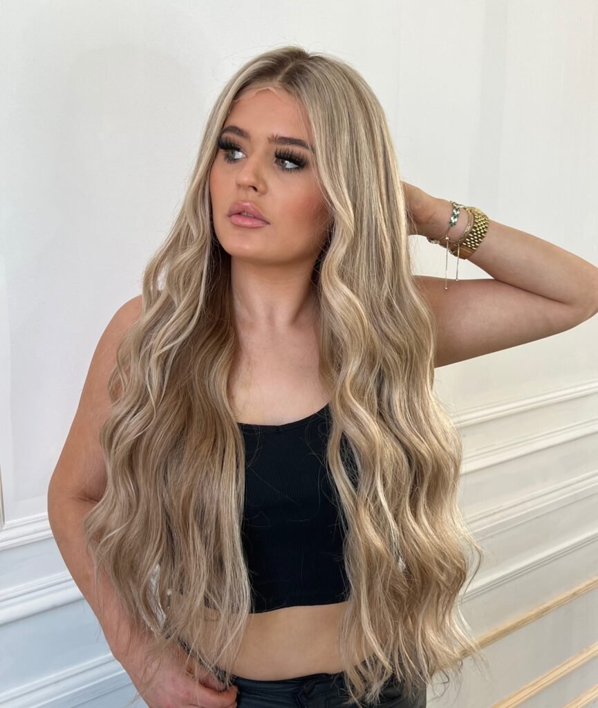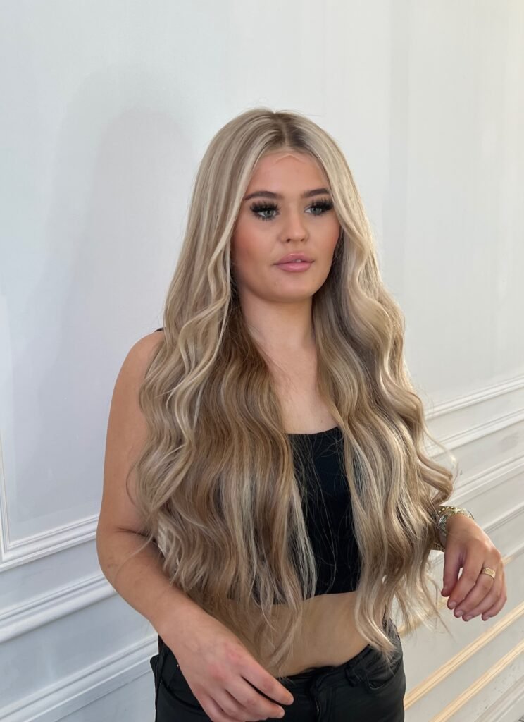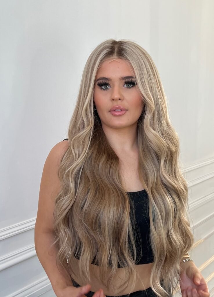 Colour: Beige blonde with light brown root and beige blonde lowlights.