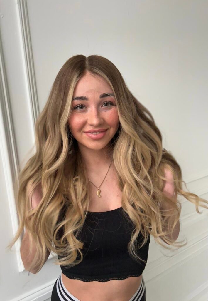 Colour: Dark blonde root melting into light golden blonde ends with face-framing highlights.