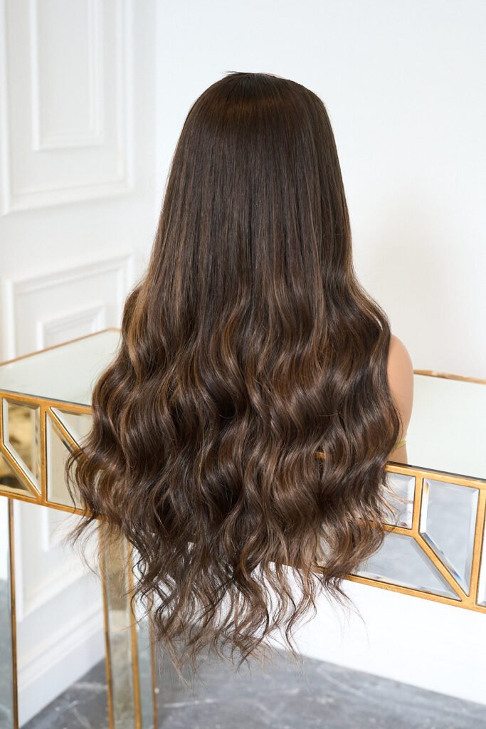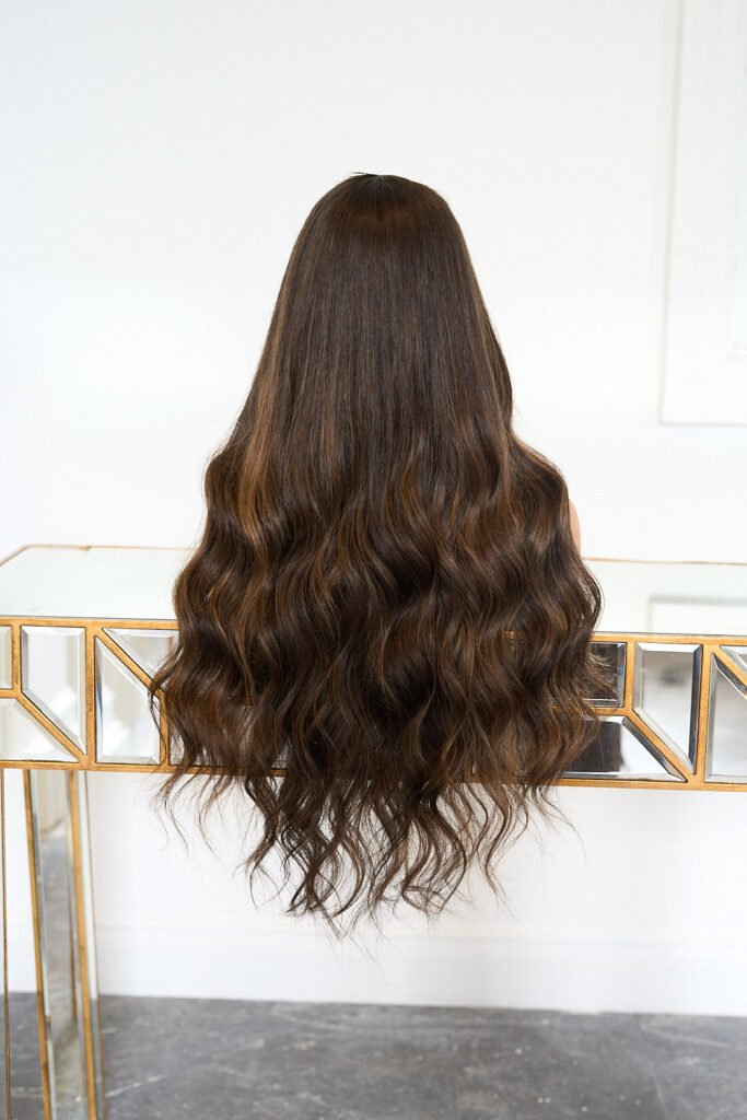 Colour: Balayage dark chocolate brown root melting into dark chocolate brown and caramel blond.