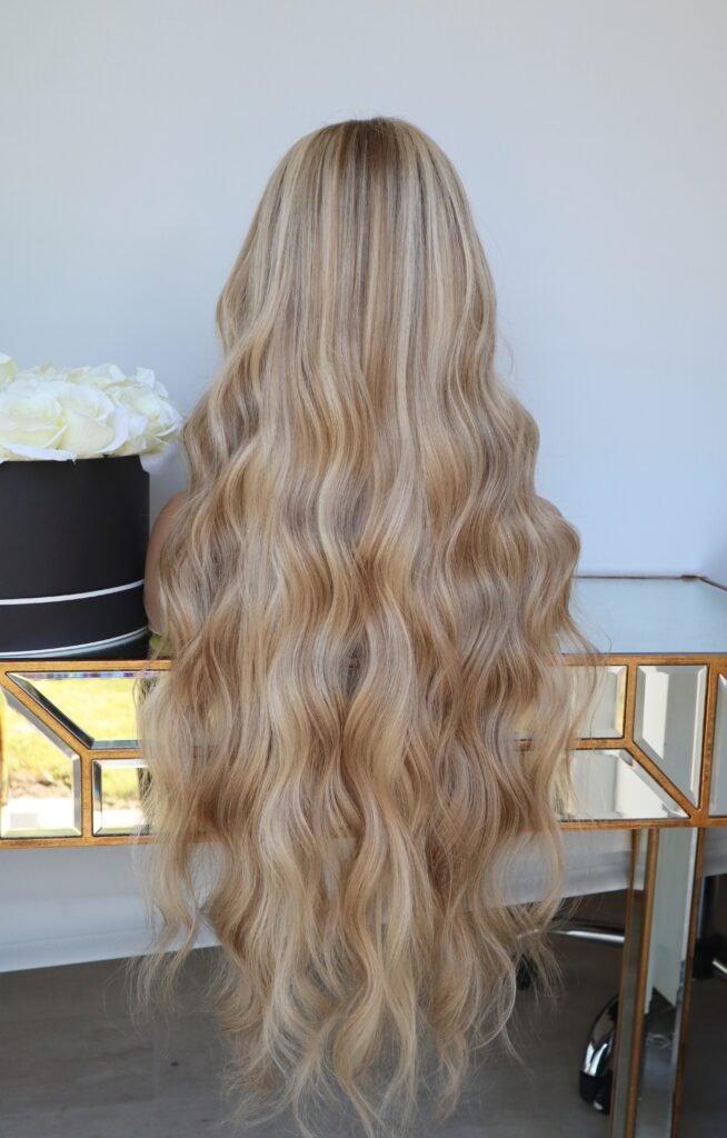 She is a full lace wig with transparent lace, bleached knots, clips, combs and an adjustable elastic band for the perfect glue less fit. She can be put in a middle/side part and can be put up in a ponytail.