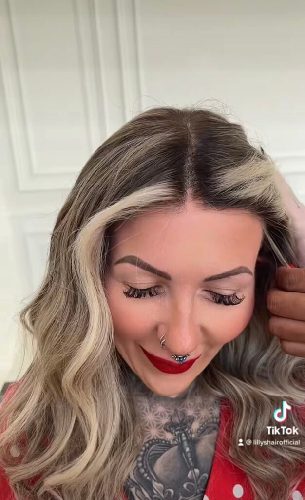 Colour: Dark ash-blonde root melting into medium blonde and platinum blonde mix with chunky face framing highlight.