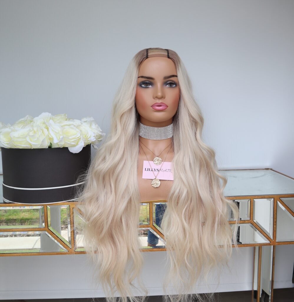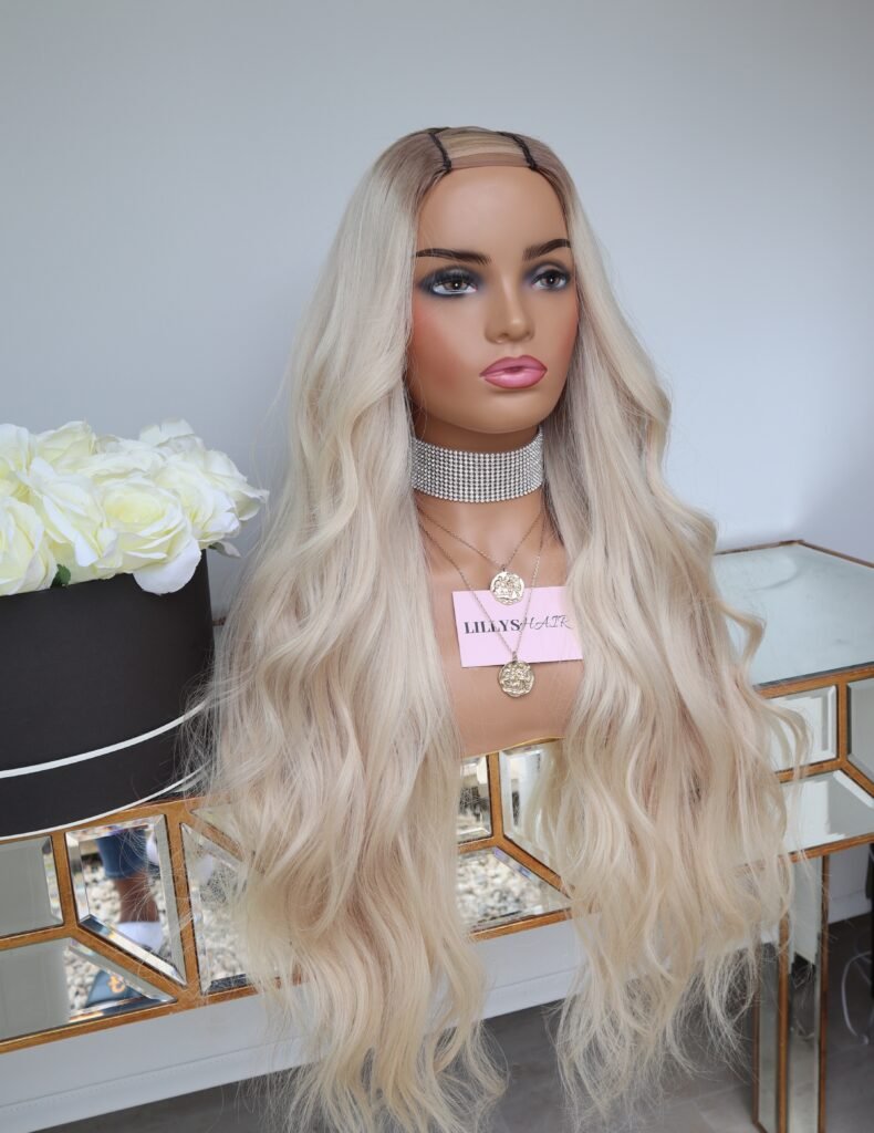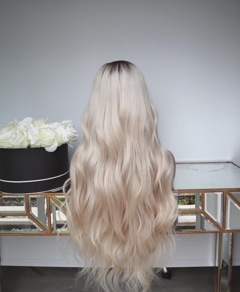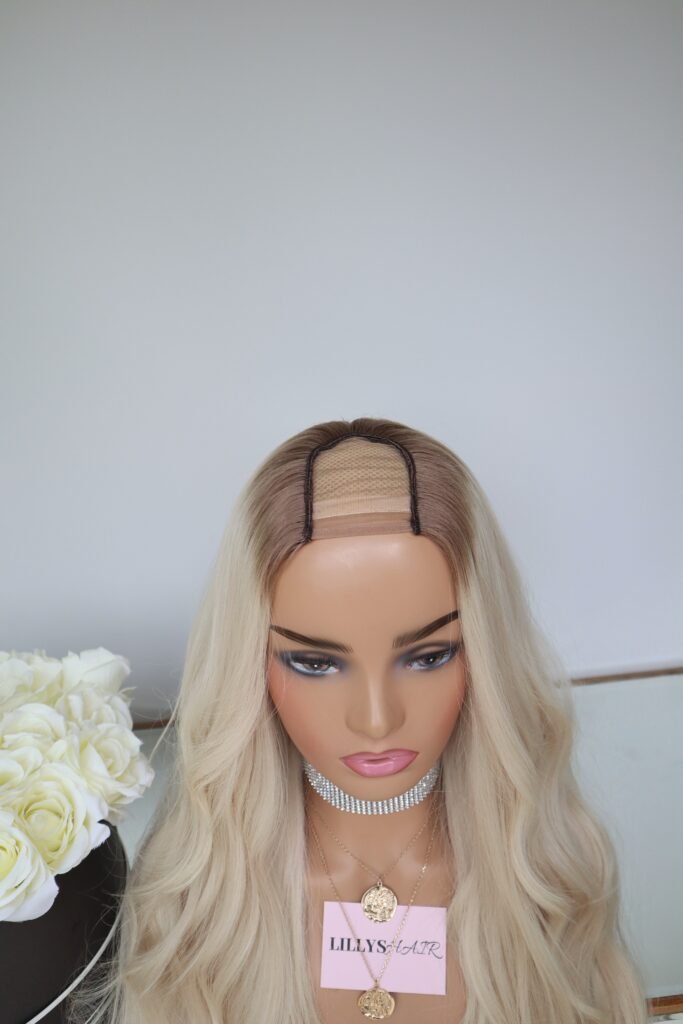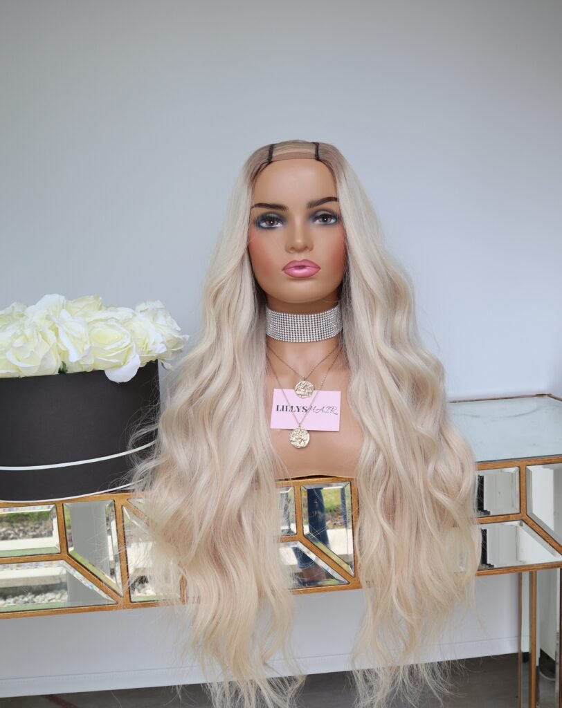Colour: 1″ Medium Blonde level 8 root with Platinum blonde ends.