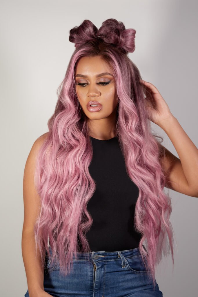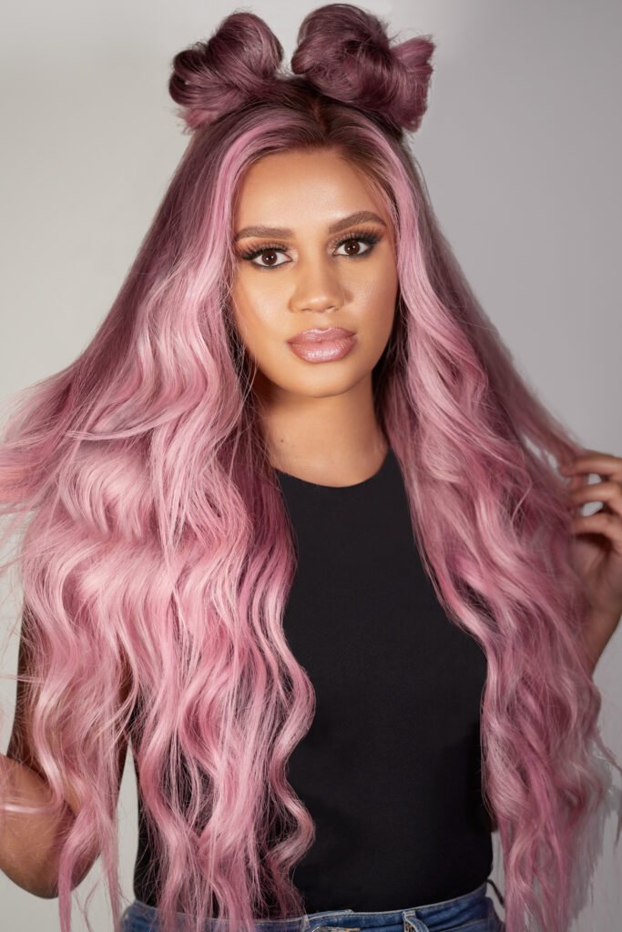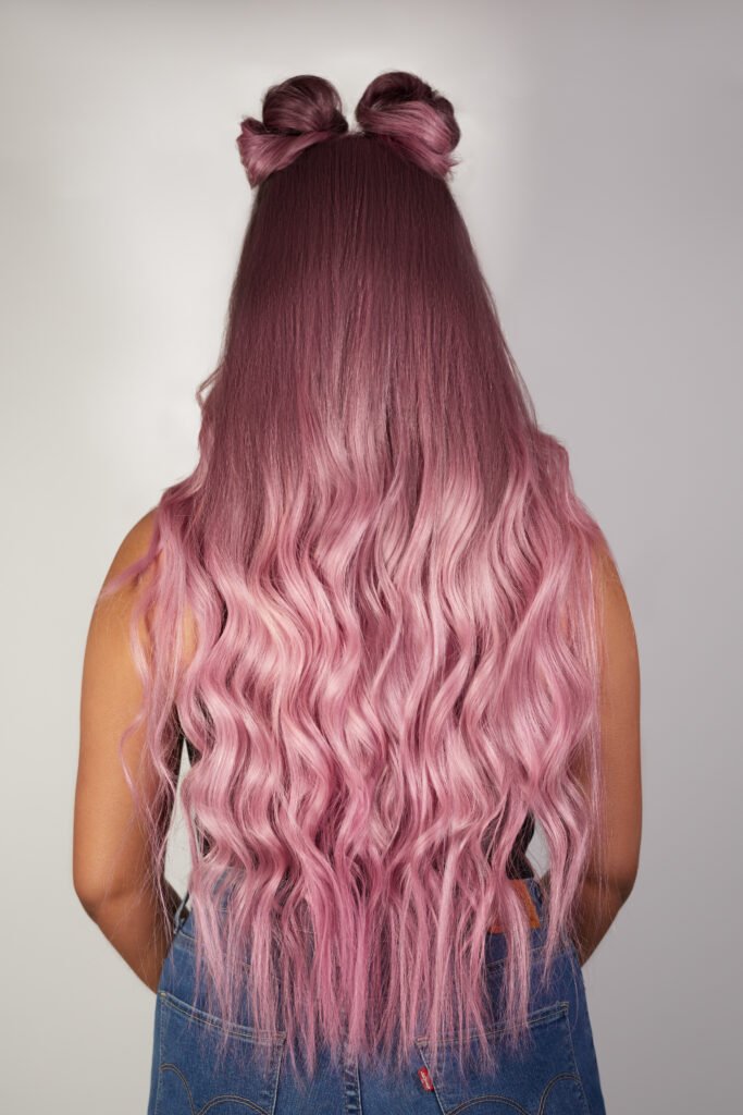 Colour: Balayage dark blonde root melting into pastel pink
