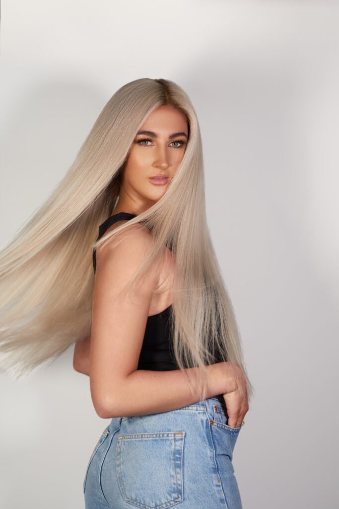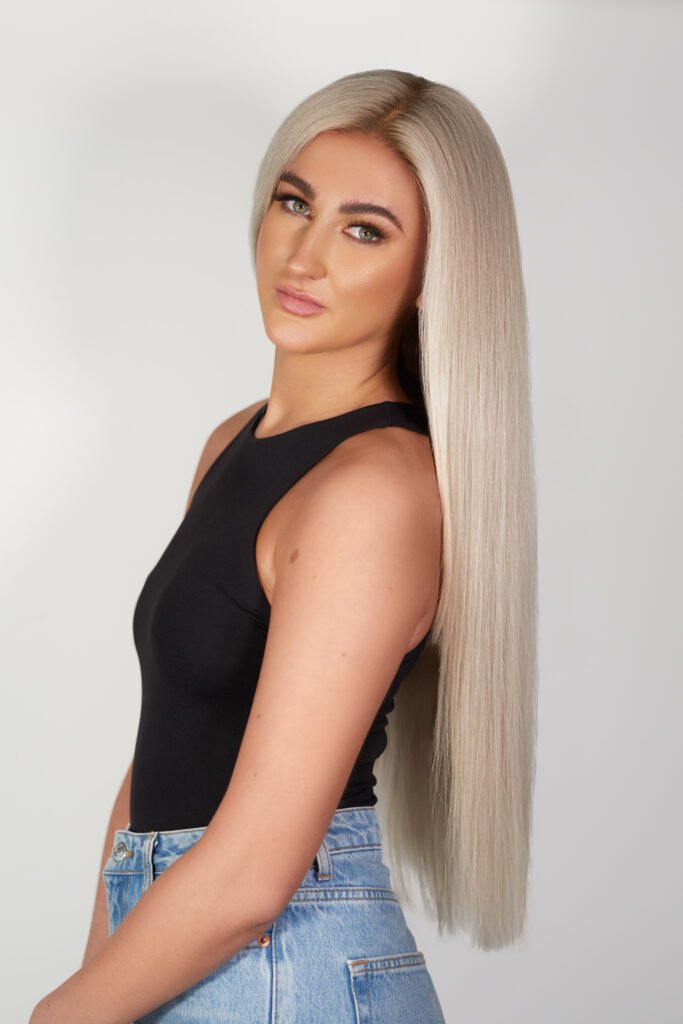 Colour: Level 8 highlighted ash-blonde base melting into platinum blonde with level 6-7 grown out root.