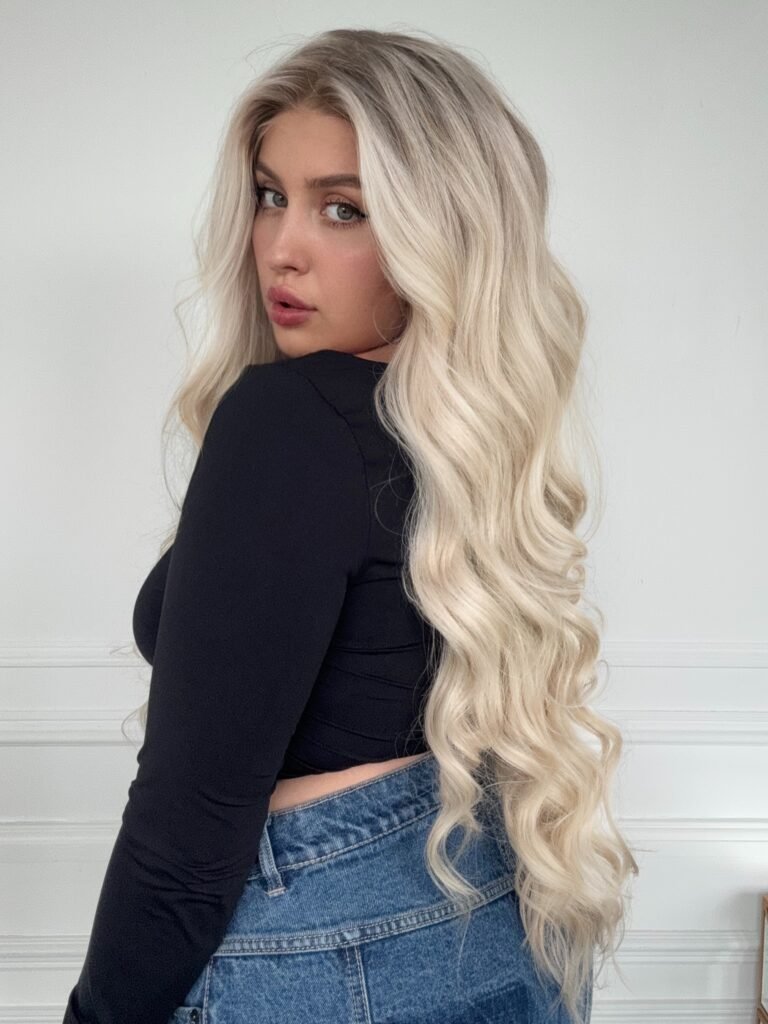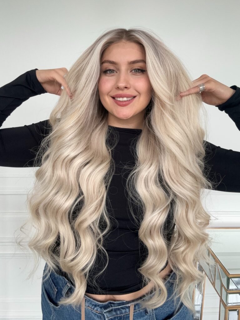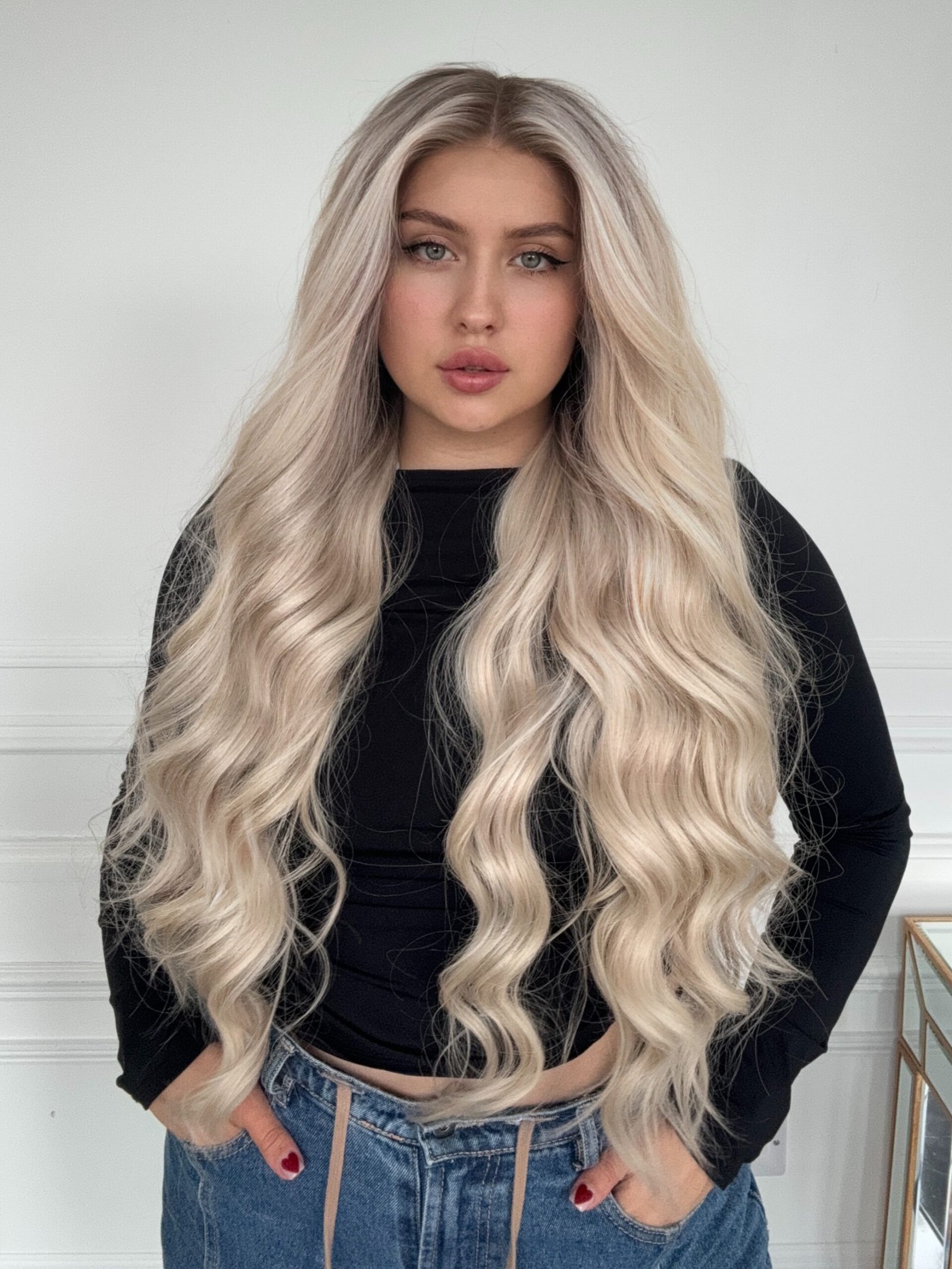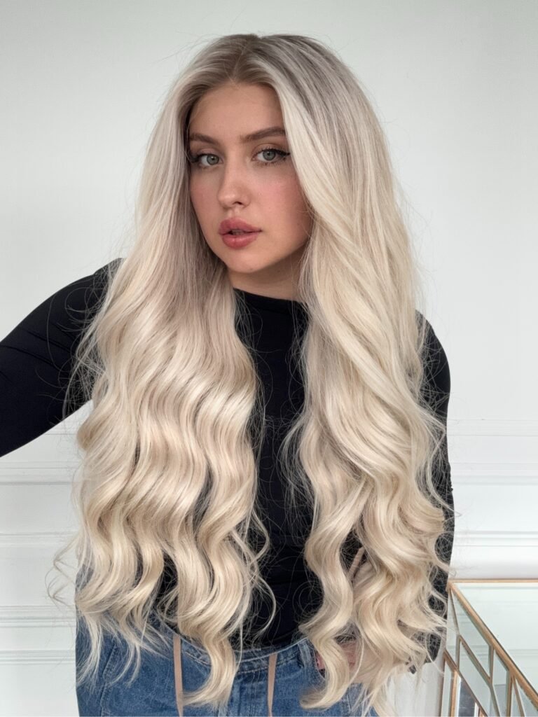 Colour: Highlighted blonde level 8 root melting into light creamy platinum blonde.
