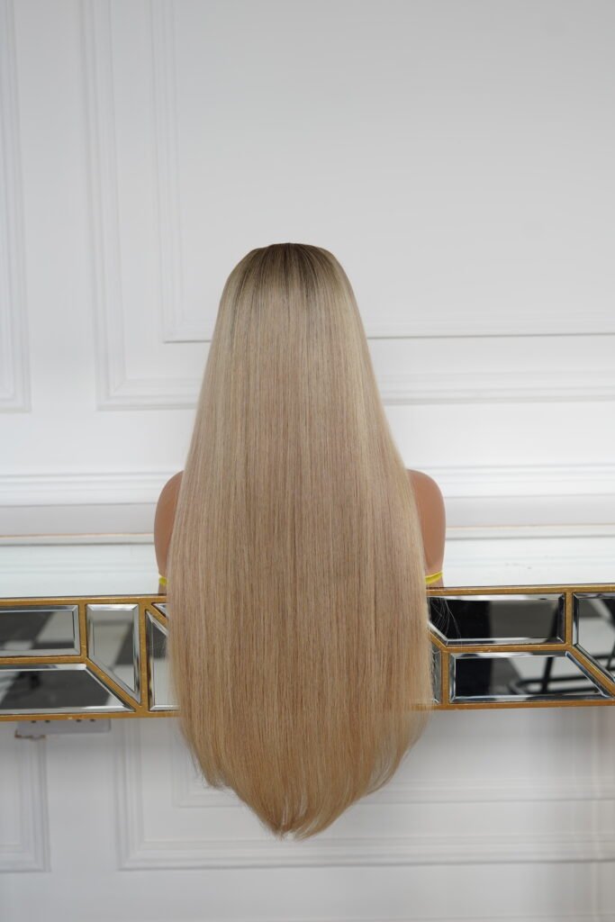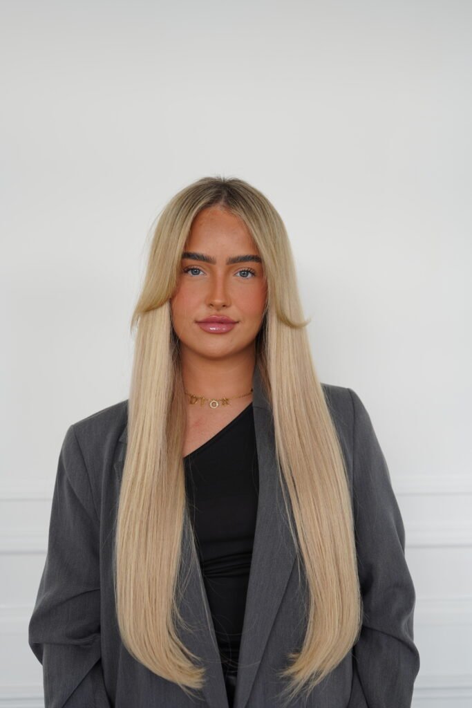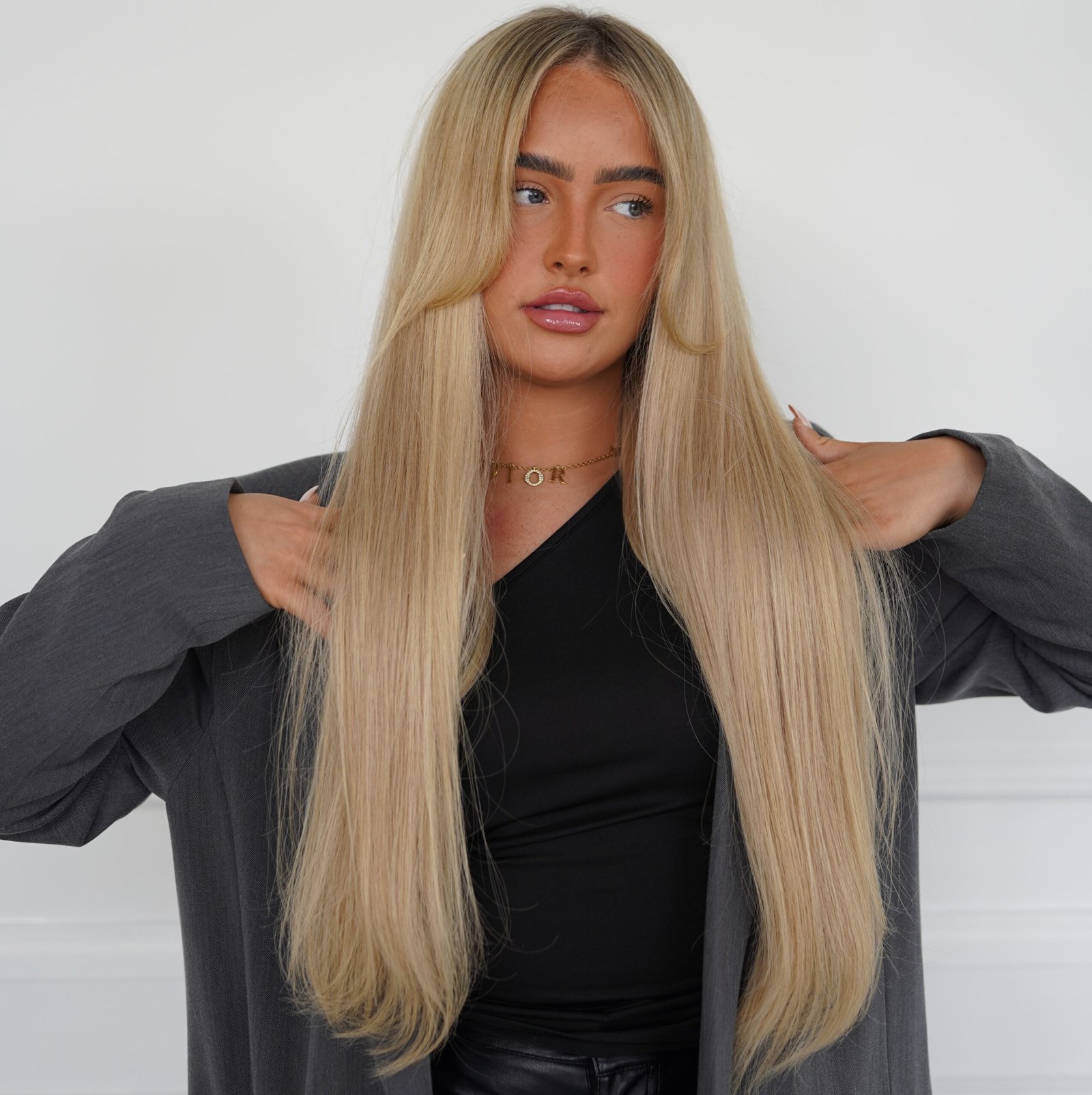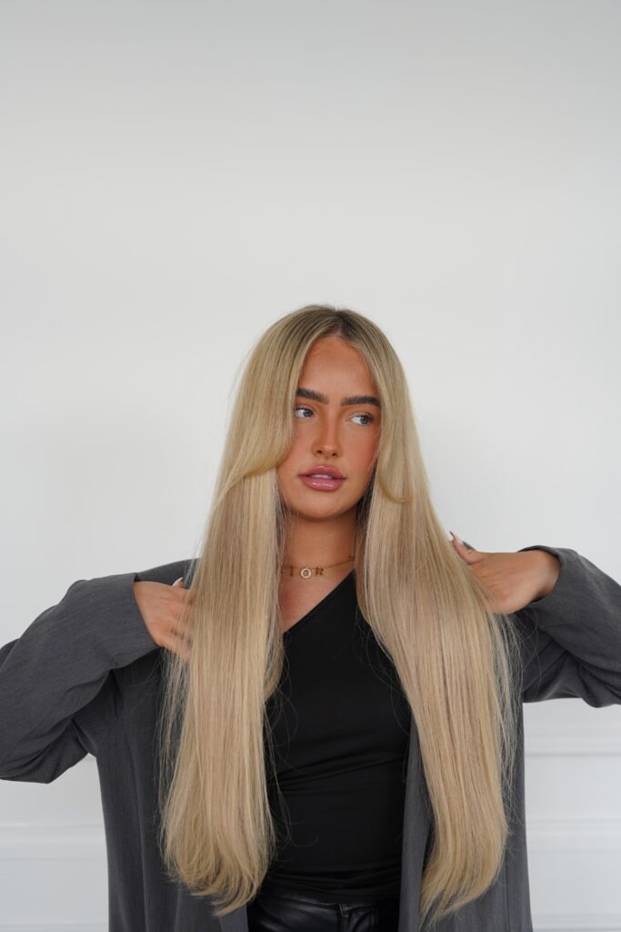 Colour: 1″ Medium Blonde level 7 root melting into mixed light blonde.