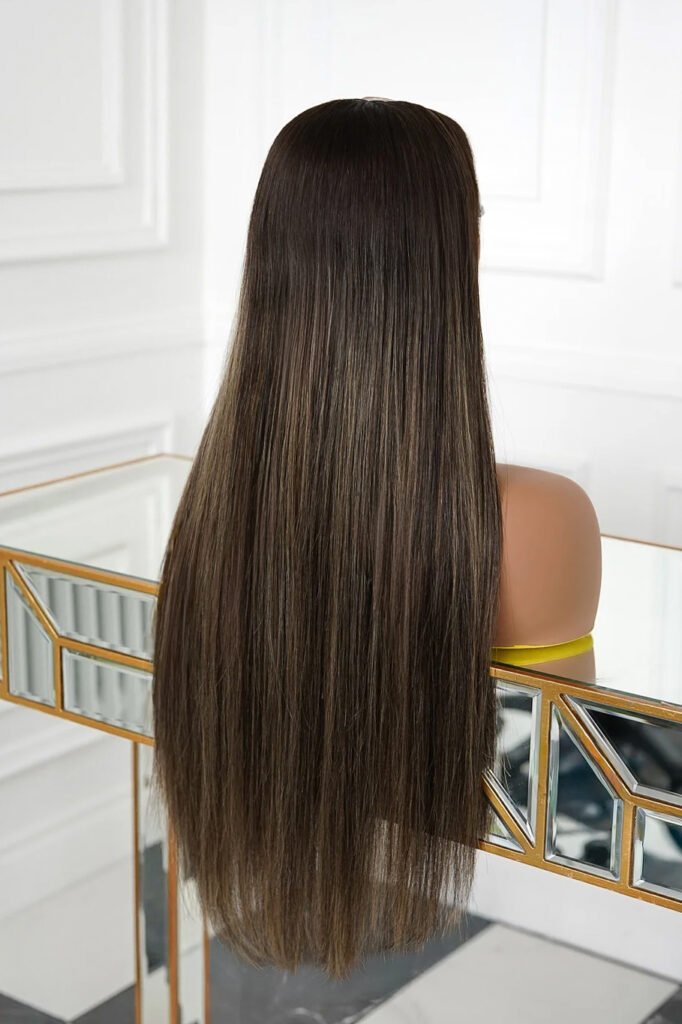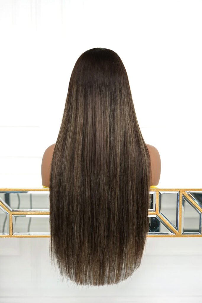 Colour: Balayage dark chocolate brown root melting into dark chocolate brown and blonde highlights.