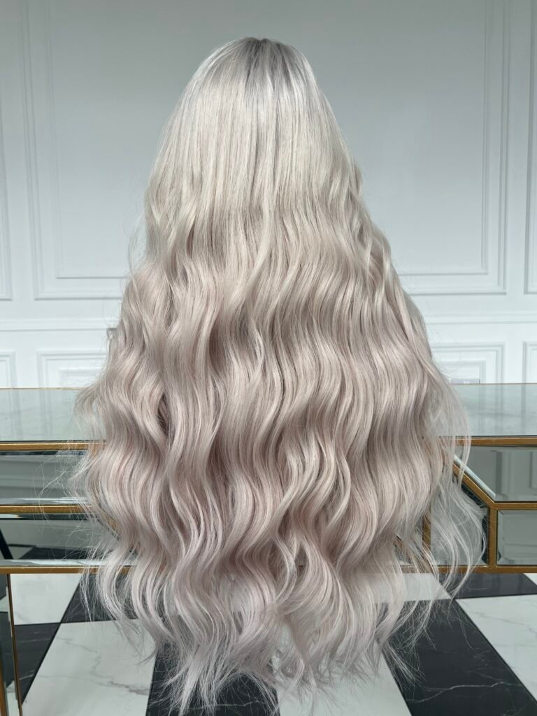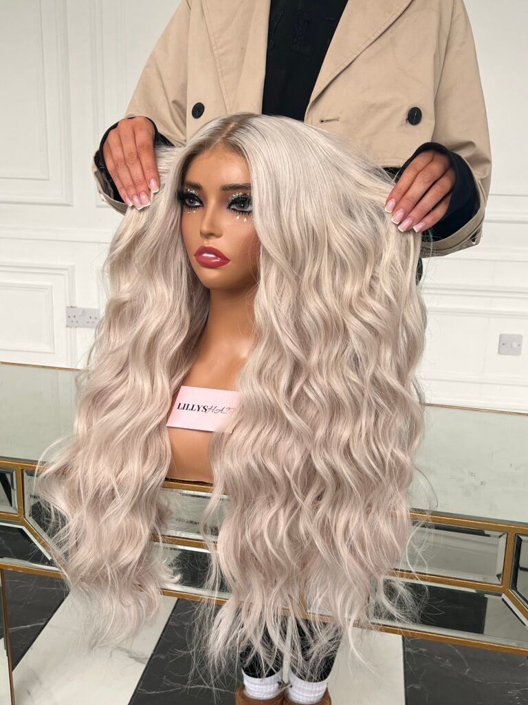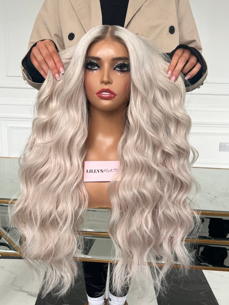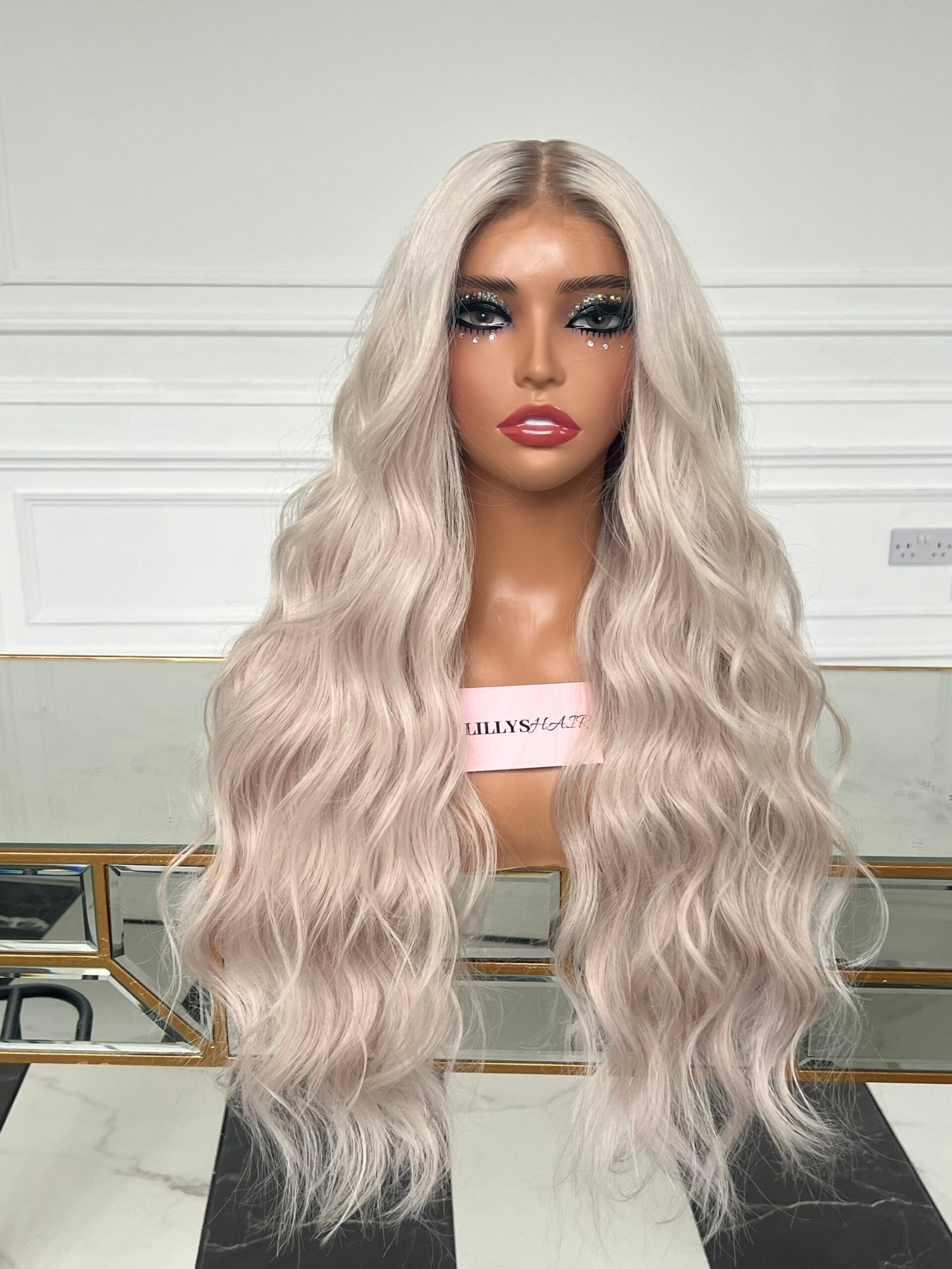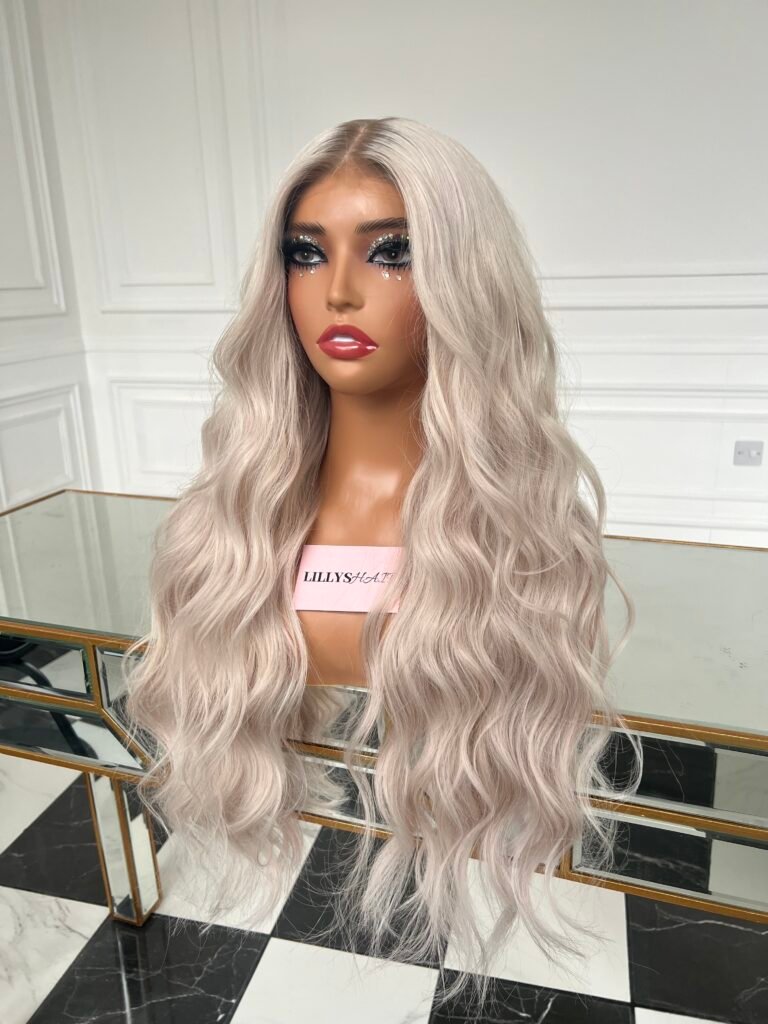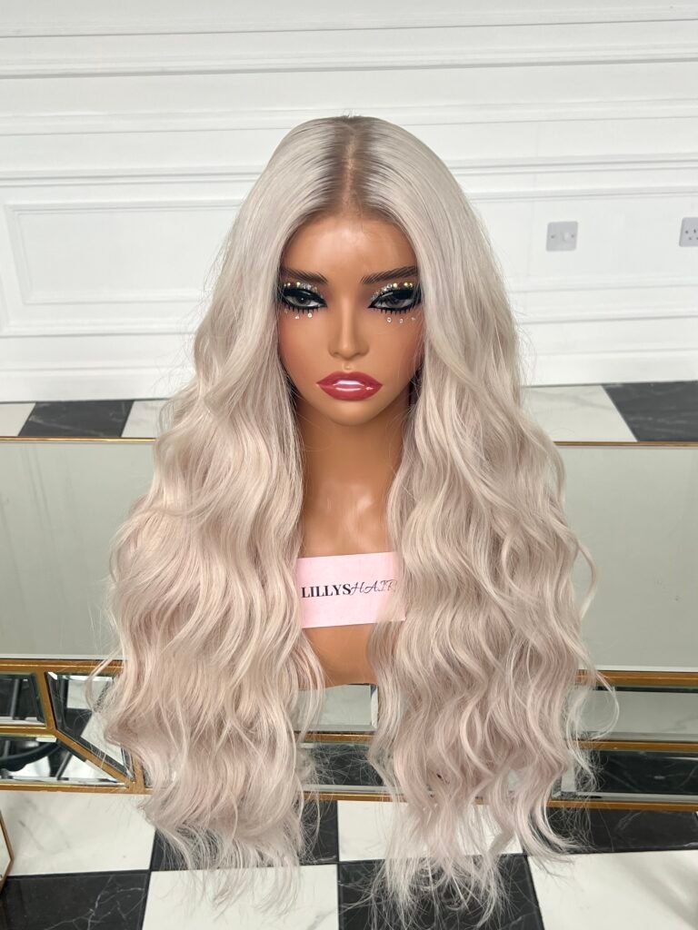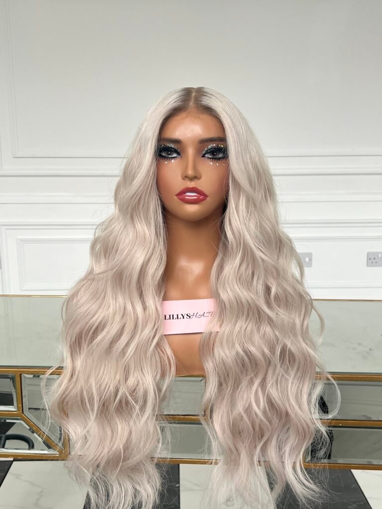 Colour: Platinum blonde with a medium level 8 ash blonde root.